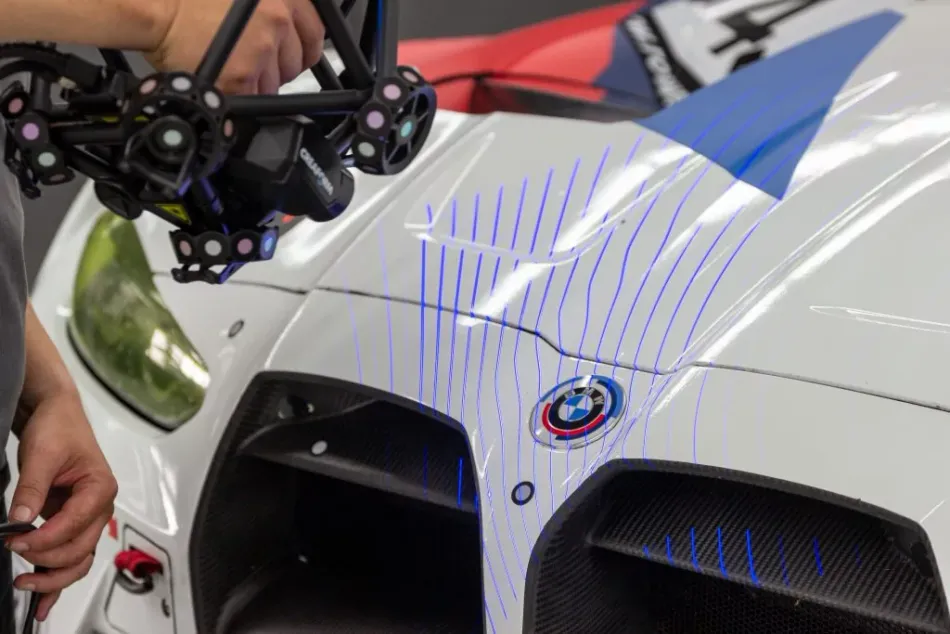 The MetraSCAN BLACK | Elite is the leading metrology-grade 3D scanner and was perfect for BMW Motorsport’s needs. Thanks to its dynamic referencing, the vehicle and measuring system can be moved easily during the scanning process. Vibrations or leapfrogging issues do not impact measurement accuracy or reliability. With its 30 blue laser lines, the MetraSCAN 3D quickly detects all surfaces and generates high-resolution results, including on glossy finishes. What’s more: chalk spray is not needed—even with black paint or chrome under sunlight.