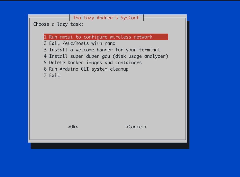 “I would like to create a shell script running on Debian with a nice interface. I want to run some binaries and launch external scripts. Create the skeleton for the menu, and two examples: one for running a binary and one for executing a script.”