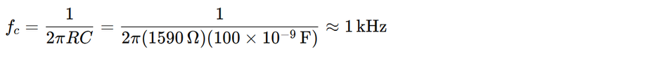 Suppose you need to limit noise above 1 kHz from a sensor signal. Choosing R=1.59 kΩ and C=100 nF yields: