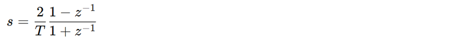 where T=1/fs is the sampling interval. The bilinear transform maps the analog jω-axis onto the unit circle in the z-plane, preserving stability by ensuring that poles in the left half of the s-plane map inside the unit circle.