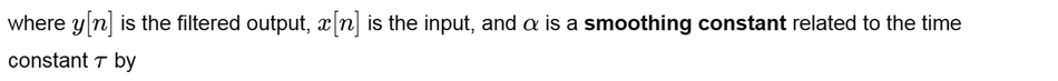 Smaller α provides more substantial attenuation of high-frequency noise but introduces greater phase delay. This simple algorithm is widely used in microcontrollers, sensors, and audio processing, where computational efficiency is critical.