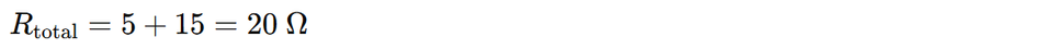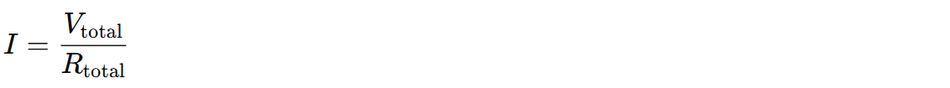 The total voltage from the power supply is distributed across the components, and the overall current can be found using: