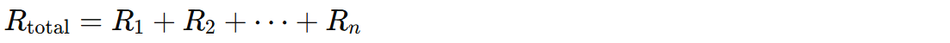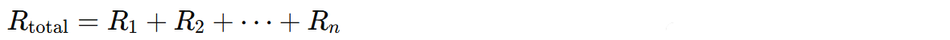 In a series circuit, the same current flows through all components, and the total resistance is the sum of all individual resistances: