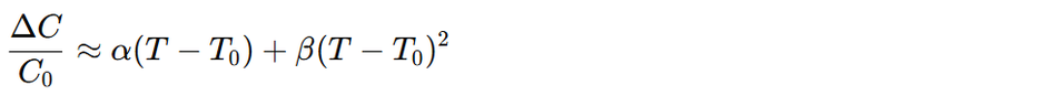 Where α and β are empirical coefficients. For X7R capacitors, α ≈ −400 ppm/°C with minimal β, giving a relatively flat response up to 125°C. The X5R capacitors follow the same model but are guaranteed only to 85°C; above this, drift may exceed ±15%.