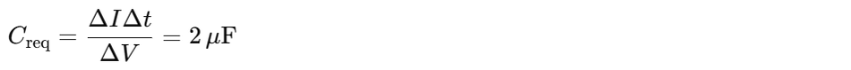 Consider an MCU drawing 200 mA transients in 50 ns, with an allowable ripple of 50 mV. The required decoupling capacitance is: