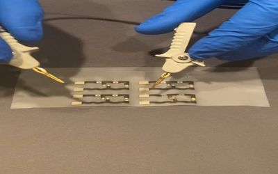 Wearable electronic textiles are a demanding environment for reliable interconnects – the ability to function with movement and survive multiple cleanings and reuse. Good adhesion is particularly challenging in these wearable and conformable electronics applications. While solders provide the most conductive electrical connection, they are rigid and require not only the addition of an underfill adhesive but usually a post bond encapsulation. This Anisotropic Conductive Epoxy, provides reliable interconnections between electronic components and circuitry on textiles with excellent structural bonding, without encapsulation, even under repeated stretching and washings. This technology has been shown as a scalable assembly process for e-Textile manufacturing in an SMT line.